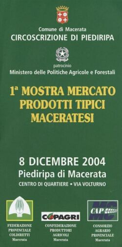 Mercoledì 8 Dicembre, con inizio alle ore 9, la Circoscrizione di Piediripa organizza la prima Mostra Mercato dei Prodotti Tipici Maceratesi che avrà luogo nel nuovo Centro di Quartiere, in via Volturno, con il patrocinio del Ministero delle Politiche Agricole e Forestali. Aziende agricole e produttori della Provincia di Macerata metteranno in esposizione e in vendita diretta i prodotti tipici del territorio maceratese. Seguirà, dalle ore 12 in poi, la degustazione della “Pasta Amica”, la nuova pasta di semola a grano duro prodotta con frumento esclusivamente marchigiano conservato a freddo, offerta dalla Coldiretti e dalla Cooperativa “La Marca”. Alle ore 17 si terrà il convegno sul Decreto Alemanno che prevede la libertà di scelta sugli OGM (Organismi Geneticamente Modificati); il Presidente della Circoscrizione Andrea Blarasin introdurrà il dibattito al quale interverranno Giuseppe Nardi, Presidente Copagri Macerata, Luigi Masnari, Direttore Coldiretti Macerata e, per il Ministero delle Politiche Agricole e Forestali, il Dr Giovanni Monastra, Coordinatore Scientifico INRAN (Istituto Nazionale per gli Alimenti e la Nutrizione), responsabile del Progetto OGM in Agricoltura. Al termine verranno offerti a tutti i presenti vino cotto, castagne, cioccolato e dolci della tradizione tipica maceratese.